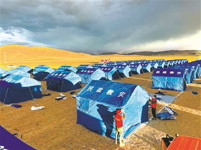 西藏自治区本轮疫情发生后,阿里地区改则县在第一时间组织应急分队建设“帐篷方舱医院”。该医院于8月16日下午启动,8月17日晚上20时正式投入运行。图为建设完成的“帐篷方舱医院”。(图片来源:人民视觉)