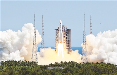 党的十八大以来,我国航天事业不断刷新纪录,航天科技水平实现跨越式发展,一次次飞天逐梦,一次次将梦想变为现实。图为7月24日,搭载问天实验舱的长征五号B遥三运载火箭,在我国文昌航天发射场点火发射。 新华社记者 李刚 摄