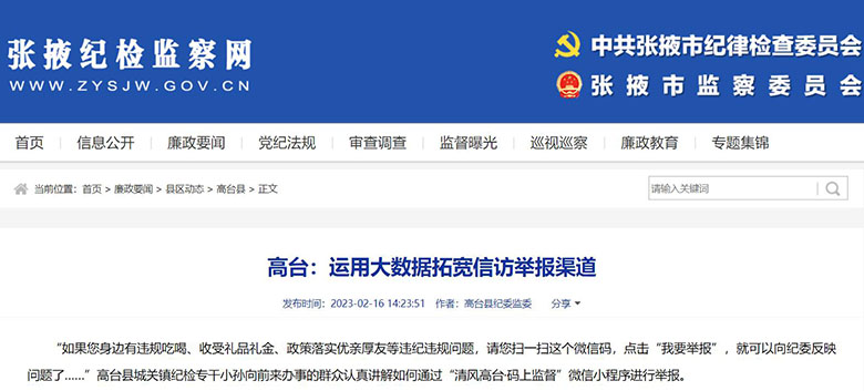 “依托信息化技术,拓宽群众监督渠道,能够更加精准地掌握和了解群众‘急难愁盼’和服务群众工作‘热点难点堵点’问题。下一步,我们将不断巩固拓展作风建设年活动成果,进一步提升群众信访举报办理质效,助推全县经济社会高质量发展。”高台县纪委监委有关负责人表示。(供稿:段雯莉 编辑:白雪)