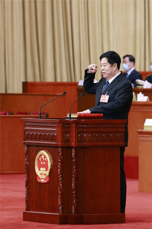 3月11日,十四届全国人大一次会议在北京人民大会堂举行第四次全体会议。刘金国当选为中华人民共和国国家监察委员会主任。这是刘金国进行宪法宣誓。 新华社记者 丁林 摄