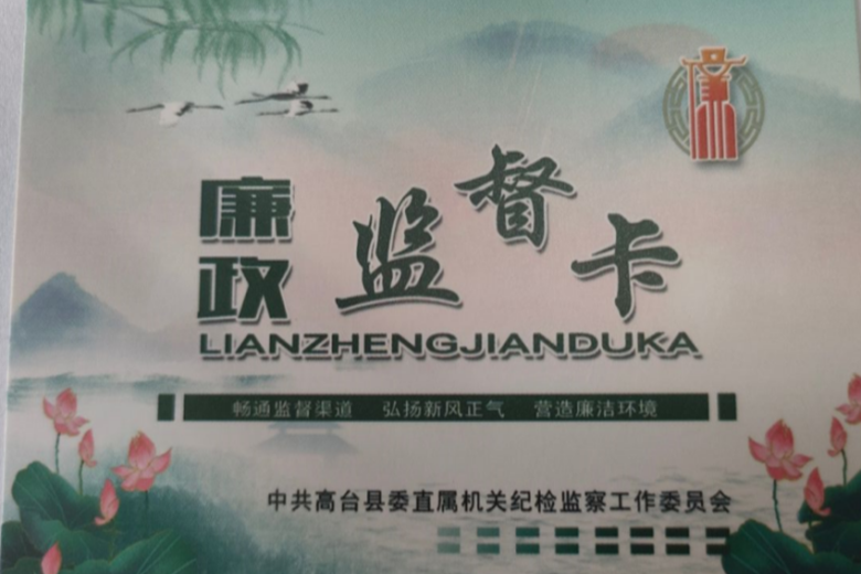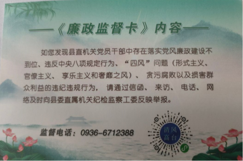 “‘廉政监督卡’一面印有廉洁从政警句,一面印有纪检监察部门监督举报方式,通过发放廉政监督卡,打开群众监督‘大窗口’,便于群众对相关政务服务工作进行监督,让党员干部在监督下积极履职、正确用权,实现监督的近距离和常态化。”县委直属机关纪检监察工委负责人介绍。