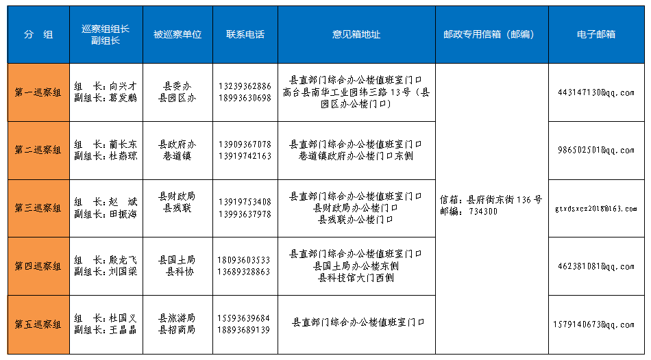 为便于干部群众反映情况、提出意见建议,县委各巡察组在被巡察单位办公地点、县直部门综合办公楼值班室门口设置巡察意见箱,并开通邮政专用信箱,设立专用电话和电子邮箱,欢迎广大干部群众反映情况。