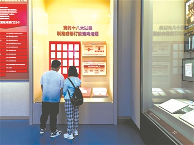 6月18日,中国共产党历史展览馆开馆三周年。图为近日,观众在党的十八大以来制定或修订的党内法规展板前驻足参观。