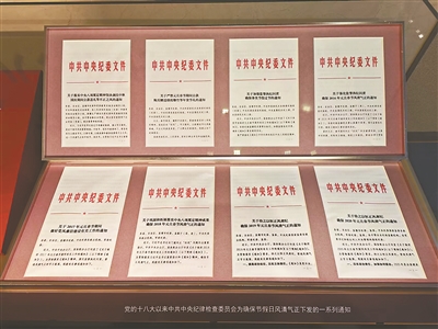 在主题展览第四部分——“推进中国特色社会主义进入新时代,全面建成小康社会,开启全面建设社会主义现代化国家新征程”的展品中,不仅有习近平总书记在地方考察缴纳伙食费的票据和在招待所用餐时的点菜单,还有中央八项规定、党的十八大以来制定或修订的党内法规等展板,还可以看到党的十八大以来中共中央纪律检查委员会为确保节假日风清气正下发的一系列通知。