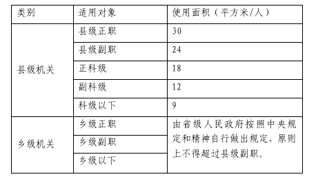 49.各级工作人员办公室使用面积标准:县级正职30㎡;县级副职24㎡;正科级18㎡;副科级12㎡;科级以下9㎡;镇机关由省级人民政府按照中央规定和精神自行做出规定,原则上不得超过县级副职。