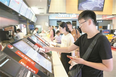 近期,多部暑期档热门影片上映,周末电影市场迎来观影热潮。图为近日,市民在浙江省嘉兴市南湖区一家影城取票。 新华社发(金鹏 摄)